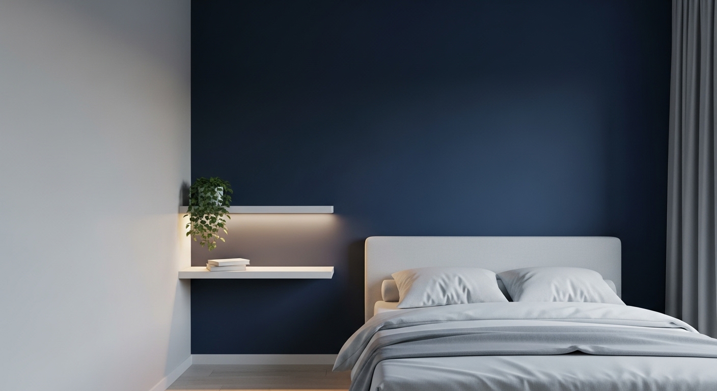 작은 방이라고 해서 모든 벽을 밝게 칠할 필요는 없어요. 오히려 한쪽 벽면에 딥 블루 같은 어두운 색상을 과감하게 사용하는 것이 좋습니다. 이 악센트 벽은 시선을 집중시켜 공간에 깊이감을 더하고, 시각적으로 방의 폭을 넓게 느껴지게 하는 착시 효과를 줄 수 있습니다. 나머지 벽은 밝은 톤으로 유지하여 균형을 맞춰주는 것이 중요해요.
