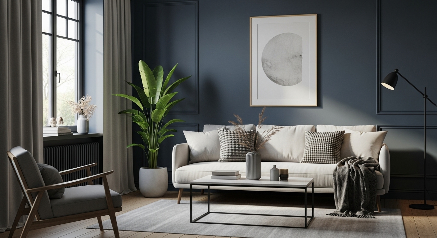 큰 면적에 어두운 색을 쓰는 것이 부담스럽다면, 가구나 소품으로 색상 포인트를 주는 것부터 시작해 보세요. 딥 블루 계열의 소파, 스모키 그레이 러그, 혹은 포인트 쿠션이나 액자 같은 작은 요소들이 공간에 시각적인 흥미를 더하고 전체적인 인테리어의 완성도를 높여줍니다. 이런 식으로 조금씩 변화를 주다 보면, 점차 대담한 시도도 두렵지 않게 될 거예요.